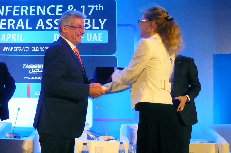 Auf der CITA Conference in Dubai präsentierte der QM-Verein die Ergebnisse seiner Arbeit bei der Sicherung der Qualität der deutschen Fahrzeugüberwachung. Dabei standen Erfolge und Arbeitsweise des QM-Vereins sowie die Qualitätsentwicklung im Mittelpunkt. Im Zusammenhang mit den Herausforderungen bei der Einrichtung von nationalen Aufsichtsstellen für Qualität in der Fahrzeugüberwachung verdeutlichte Viktor Kretzschmann, Leiter der Geschäftsstelle des QM Vereins, die hohen Anforderungen an die Qualifikation des Personals und die Tätigkeit dieser Stellen. Die Grenzen und Möglichkeiten der verschiedenen Qualitätsmessmethoden sowie die Empfehlung zu geschlossenen Regelkreisen für eine wirksame Qualitätsarbeit bildeten die Scherpunkte des Vortages. Die Fragen der anschließenden Diskussionsrunde bestätigten abermals das große Interesse an dem deutschen Modell.