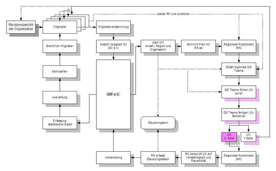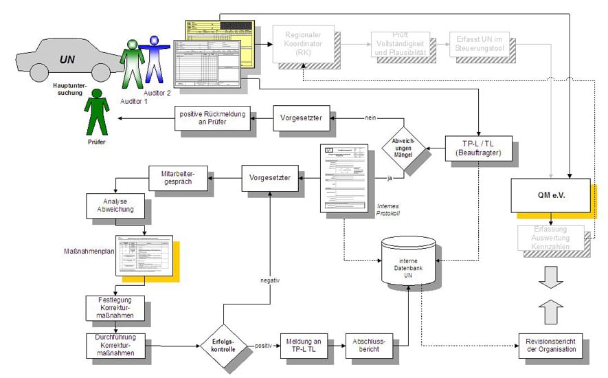 Der interne Teil des Prozesses ist Bestandteil des unternehmensinternen Qualitätsmanagementsystems, in dem beschrieben ist, wie das Unternehmen seine Qualitätsprüfungen organisiert und auf Abweichungen reagiert. Vorstehendes Diagramm zeigt beispielhaft, wie die UN in Qualitätsmanagementsysteme eingebunden werden kann.